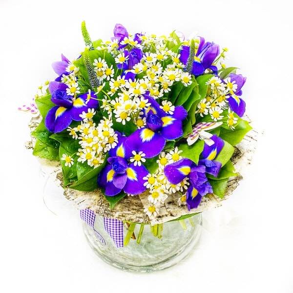 Что может быть теплее и нежнее букета из ромашек и ирисов? Такой подарок непременно поднимет настроение, зарядит массой позитива, вызовет улыбку на лице получателя.