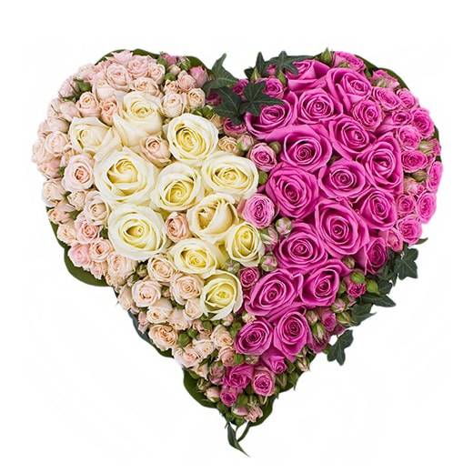 Показать свои высокие чувства поможет одноименный букет. Он выложен в форме сердца, чем делает дополнительный акцент на испытываемые эмоции. Белые одноголовые и кустарные розы олицетворяют нежность, светлость, чистоту и искренность, а розовые говорят: «Все только начинается!». Букет обрамлен зеленью, что придает еще большую натуральность и естественность. Необычная композиция поразит своими размерами и формой и запомнится на всю жизнь!